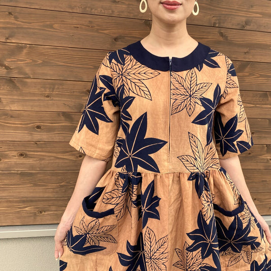 【柿渋染め浴衣ワンピース】もみじ柄 前ファスナー