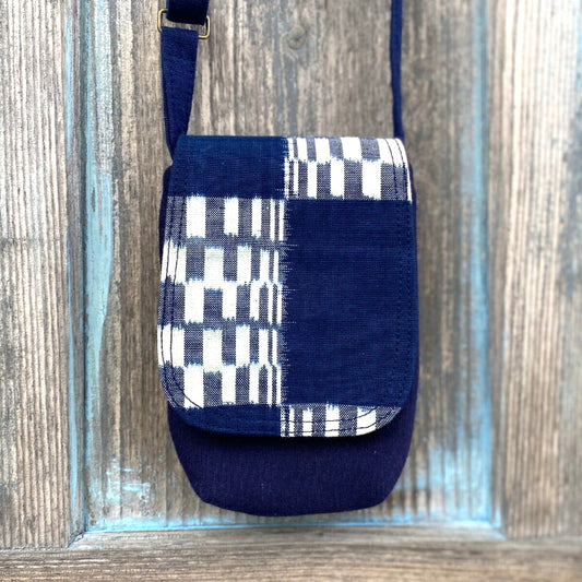 Giemon [Kurume Kasuri shoulder pochette] Hand-woven indigo-dyed pochette gift