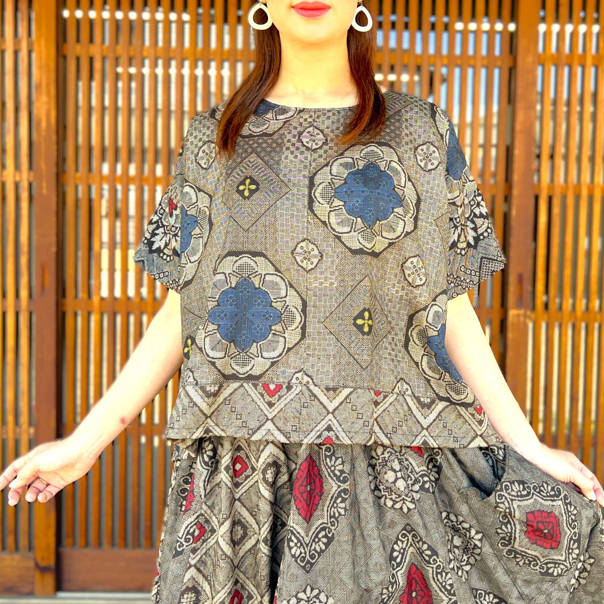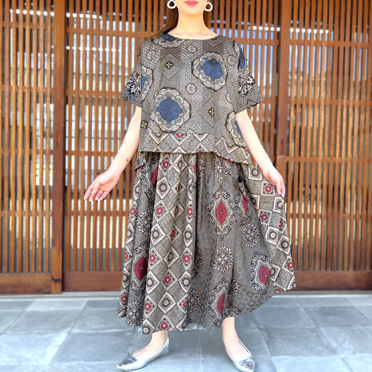 ゆったり幅のAラインブラウスとボリュームのあるコクーンスカートの女性らしいシルエットの上下セットです。