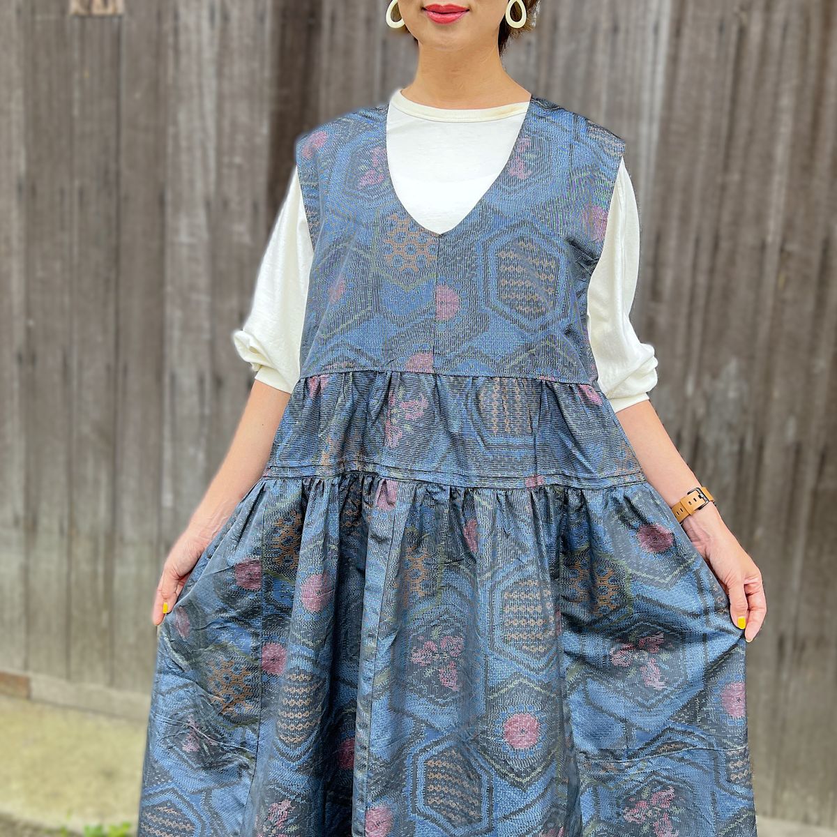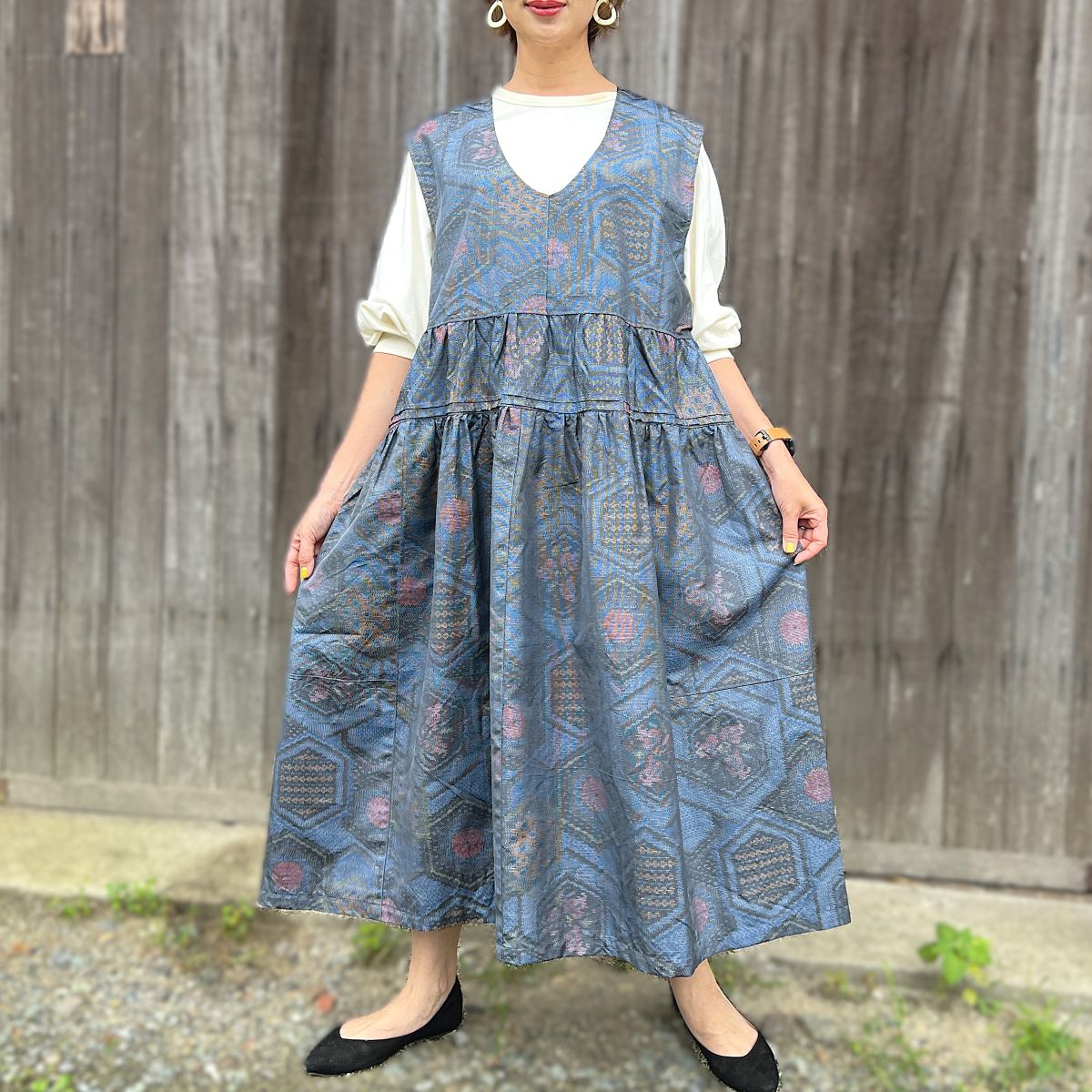 生地をたっぷり使ったボリュームのあるティアードシルエットが大人可愛い一枚です。